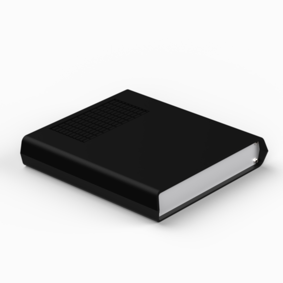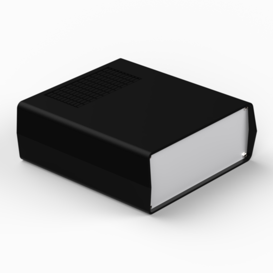 ABS enclosures with a vented cover and base for aeration. Front and rear 1 mm aluminium panels. Each half-shell has integral PCB guides and mounting studs. Matt surface finish. Closing by eight screws.
