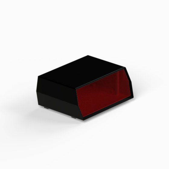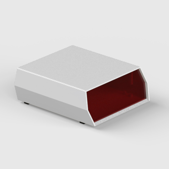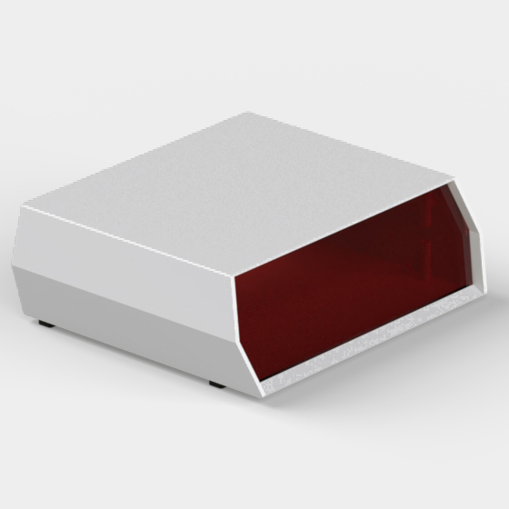 A polystyrene enclosure with a red polystyrene 20° inclined panel. Each half-shell has integral PCB mounting studs. The models “D/13” and “D/14” have in the rear side a cutout for cabling. Matt surface finish. Closing by four screws.
