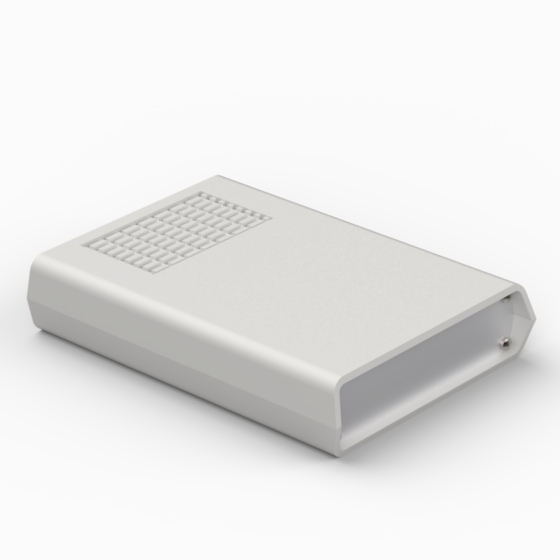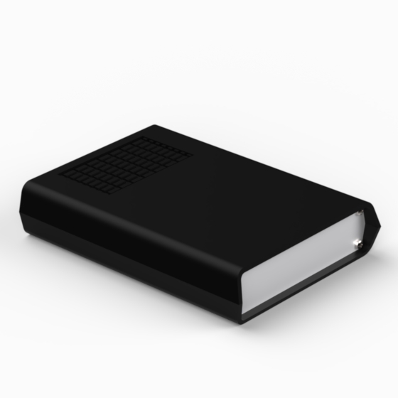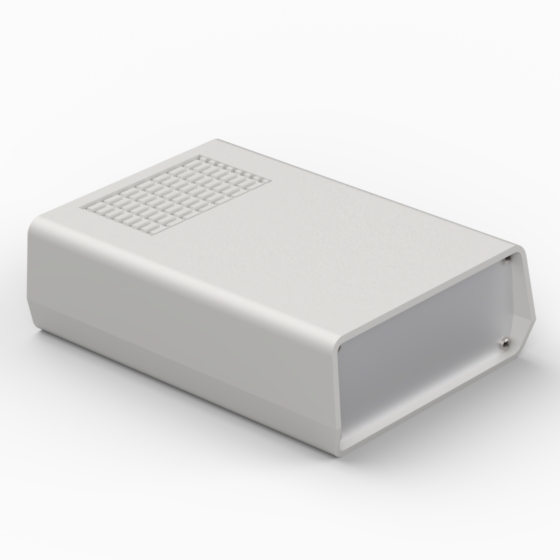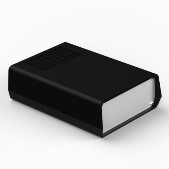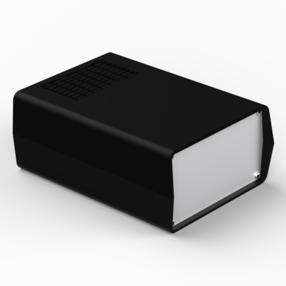 ABS enclosures with a vented cover and base for aeration. Front and rear 1 mm aluminium panels. Each half-shell has integral PCB guides and mounting studs. Matt surface finish. Closing by eight screws.