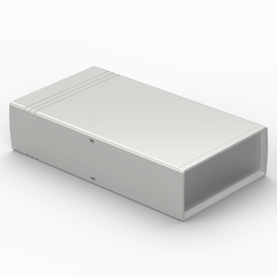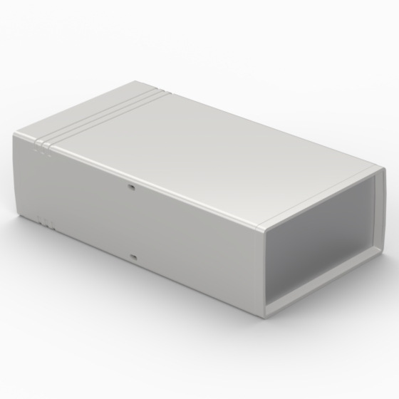 ABS enclosures with two 1 mm aluminium panels. Each base and cover have integral PCB guides (Eurocard 100 x 160 mm) inside. Matt surface finish. Snap-together closing, no screws required.