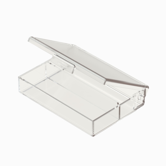 Series of small storage boxes with hinged transparent polystyrene lid. Glossy surfaces finish.