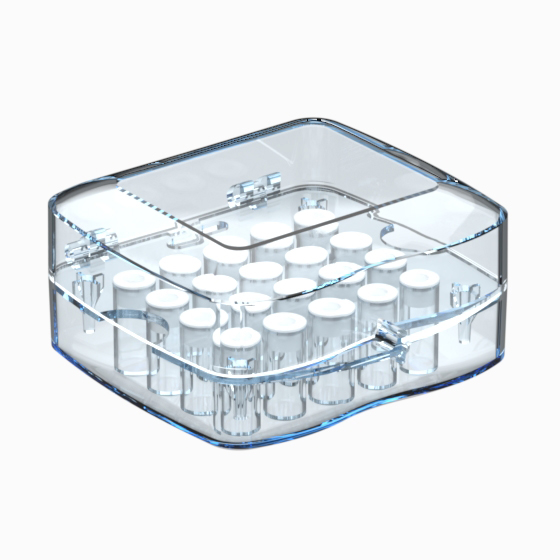 Attractive and modern designed, this box is moulded in transparent metacrylate. It holds twenty tubes with a height of 25 mm or of 40 mm, ideal to store and organise small electronic components.