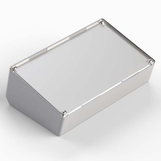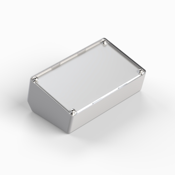ABS enclosure with a 15° inclined transparent polycarbonate cover that protects an anodised 0.5 mm aluminium panel. The base walls have integral PCB guides and mounting studs. Rounded corners. Glossy surfaces finish. Closing by four screws.