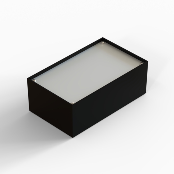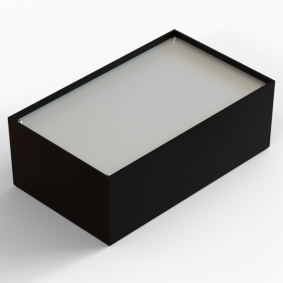 ABS enclosures with square corners and glossy surface finish. The base walls have integral PCB guides. P series have 1 mm aluminium panel.